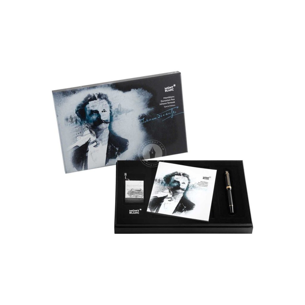 Bút bi Montblanc Donation Pen Johann Strauss Ballpoint Pen 119874 được thiết kế lấy cảm hứng từ một cây cung vĩ cầm liên quan đến niềm đam mê của Ông đới với violin. Chữ ký của Strauss cũng như chữ Montblanc được khắc tinh tế trên vòng nắp. Hộp quà tặng đặc biệt còn chứa một hộp nhạc với trích đoạn ví von nổi tiếng nhất của ông, “Donauwaltz”. Ngòi được khắc một con dơi gợi nhớ đến vở opera nổi tiếng nhất của ông, “Die Fledermaus”.
