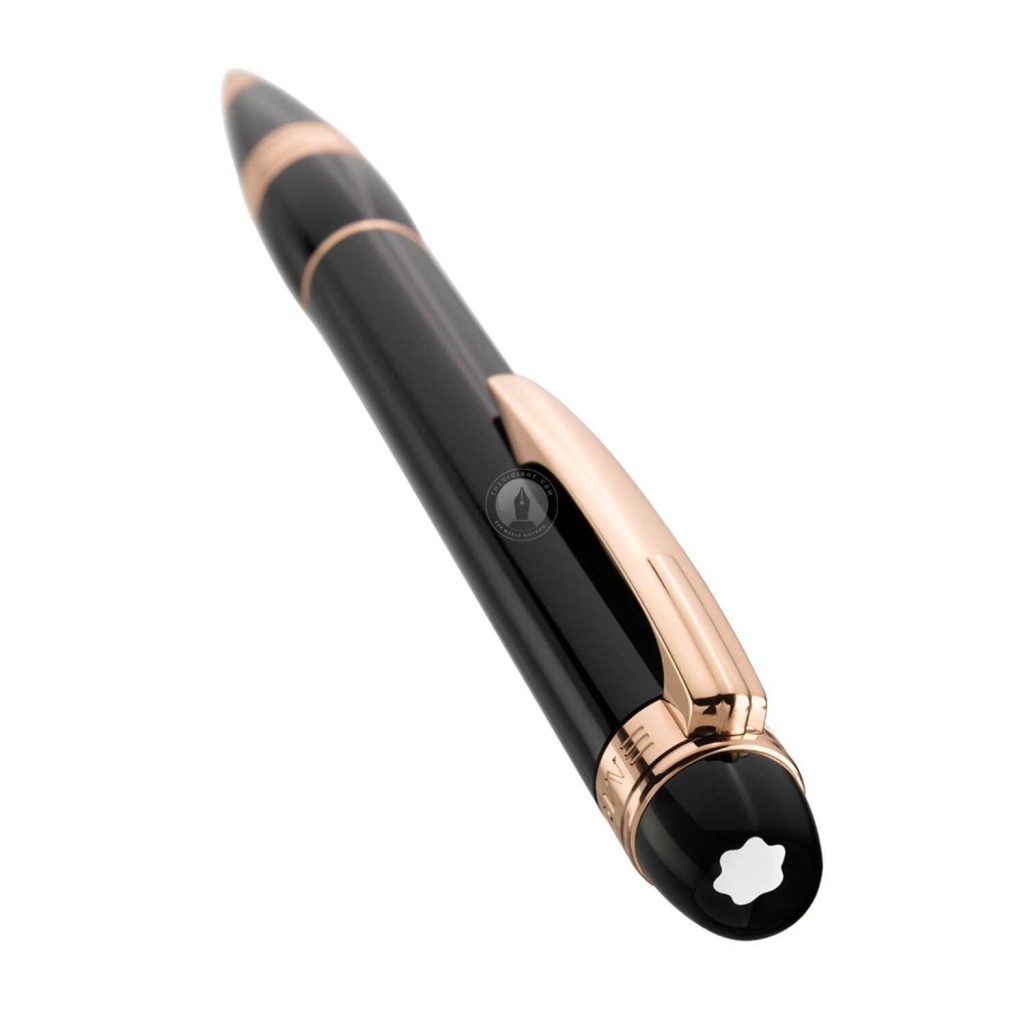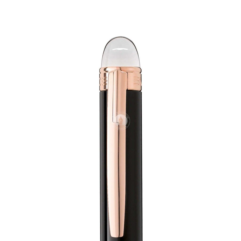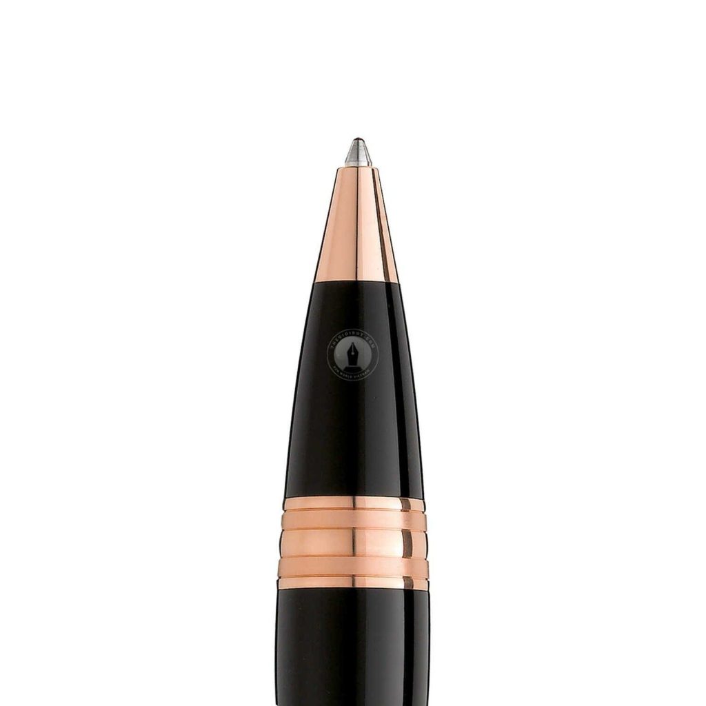 Montblanc 105653 được thiết kế đơn giản, tinh tế với thân bút màu đen bằng nhựa quý truyền thống của Montblanc, các chi tiết kim loại được mạ vàng hồng, phần logo được làm trong suốt rất bắt mắt.