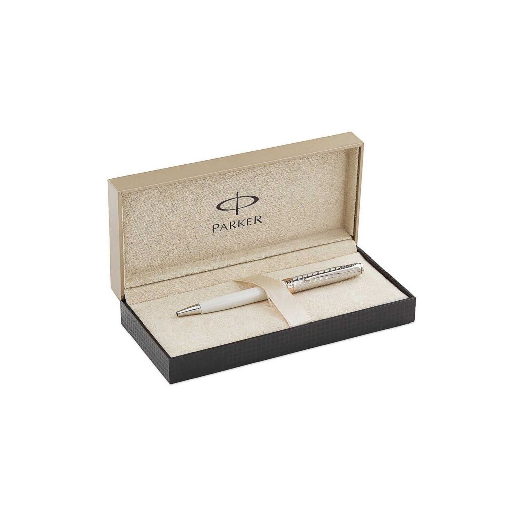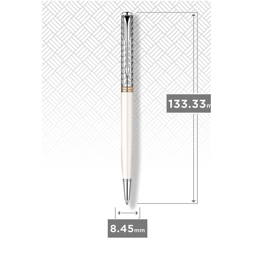 Nắp bút làm bằng thép không gỉ được tạo hoa vân tinh xảo và rất nghệ thuật. Thân bút Parker Sonnet Metal And Pearl Slim GT Ballpoint Pen được phủ nhiều lớp sơn mài màu trắng ngọc trai cao cấp cho độ bền cao và rất quyến rũ và quý phái. Chiếc bút Parker Sonnet S0947330 bao gồm 17 phụ kiện được lắp ráp bằng tay một cách tỉ mỉ để có chất lượng hoàn hảo, mang lại độ chính xác cao và sự thoải mái khi viết. Vòng khoen, đỉnh đầu nắp và nắp đậy thân cùng với cài bút Parker Sonnet với hình mũi tên đặc trưng cũng được mạ vàng hồng sáng bóng và tinh xảo. Có thể nói, chiếc bút bi Parker Sonnet là một tác phẩm của vẻ đẹp, biểu tượng của nghề thủ công Parker, mang lai phong cách tinh tế cho mọi dịp khi chúng ta viết lách.