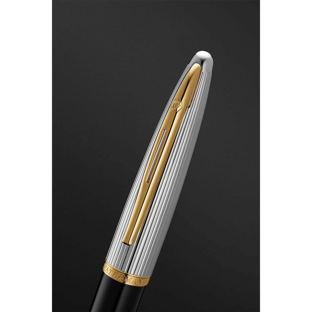 Pha trộn giữa sơn mài đen đậm là phần nắp bút mạ bạc được chạm khắc tinh xảo như một viên ngọc quý và các đường viền màu vàng để quyến rũ bạn với phong cách sang trọng và rực rỡ. Đây là một nét thiết kế độc đáo của Waterman Carene. Sự chú ý đến từng chi tiết của Carene được thể hiện qua việc sử dụng thiết kế độc đáo trên thân bút, kỹ thuật cham khắc tinh xảo đi cùng với vật liệu quý như vàng và sơn mài sẽ nâng tầm phong cách cá nhân của bạn.