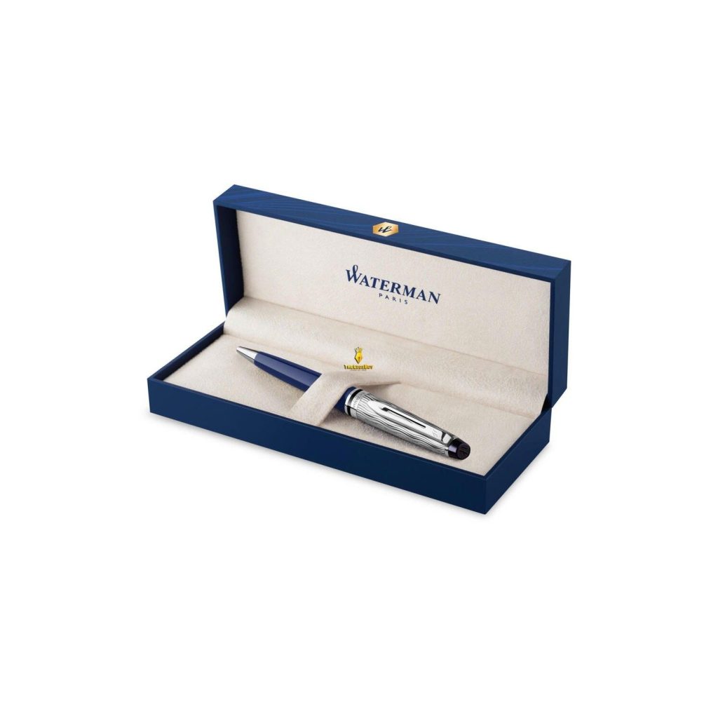 Đi kèm với chiếc bút là một chiếc hộp màu xanh dương rất đẹp mắt, thể hiện sự thông minh và lối sống hào hoa của người Pháp. Một đất nước đầy lãng mạn và giàu cảm xúc cũng là cội nguồn của những câu chuyện nổi tiếng trên thế giới. Tất cả từ bút cho đến hộp đều được sản xuất tại Pháp. Mỗi cây bút ký Waterman do Thế Giới Bút phân phối sẽ có một ruột bút được lắp sẳn vào trong thân bút, phiếu bảo hành 12 tháng và túi giấy sang trọng kèm theo.