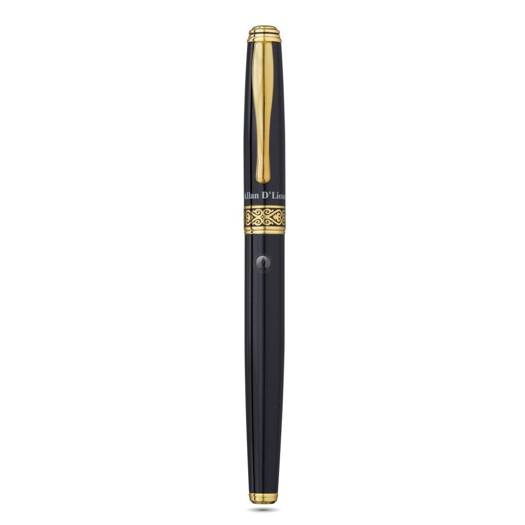 Được thiết kế theo hướng chuyên nghiệp hiện đại, bút dạ Allan D’lious 6002RG vô cùng đa năng, thông minh và ấn tượng, chắc chắn sẽ nổi bật ở bất kỳ nơi làm việc nào, chiếc bút bi này có thân làm bằng thép không rỉ phủ sơn mài đen bóng cao cấp rất sang trọng và bắt mắt. Các chi tiết như khoen, đầu cap, cài bút cũng như phần nắp đấy được phủ vàng công nghệ sáng bóng và đẹp mắt. Nổi bật nhất là hoa văn của vòng khoen giữa thân bút Allan D’lious được tạo hình tinh xảo và nghệ thuật. Vừa mang tính nghệ thuật vừa mang tính truyền thống. Có thể nói cây bút này sở hữu một vẻ ngoài cứng cáp và rất chắc chắn.