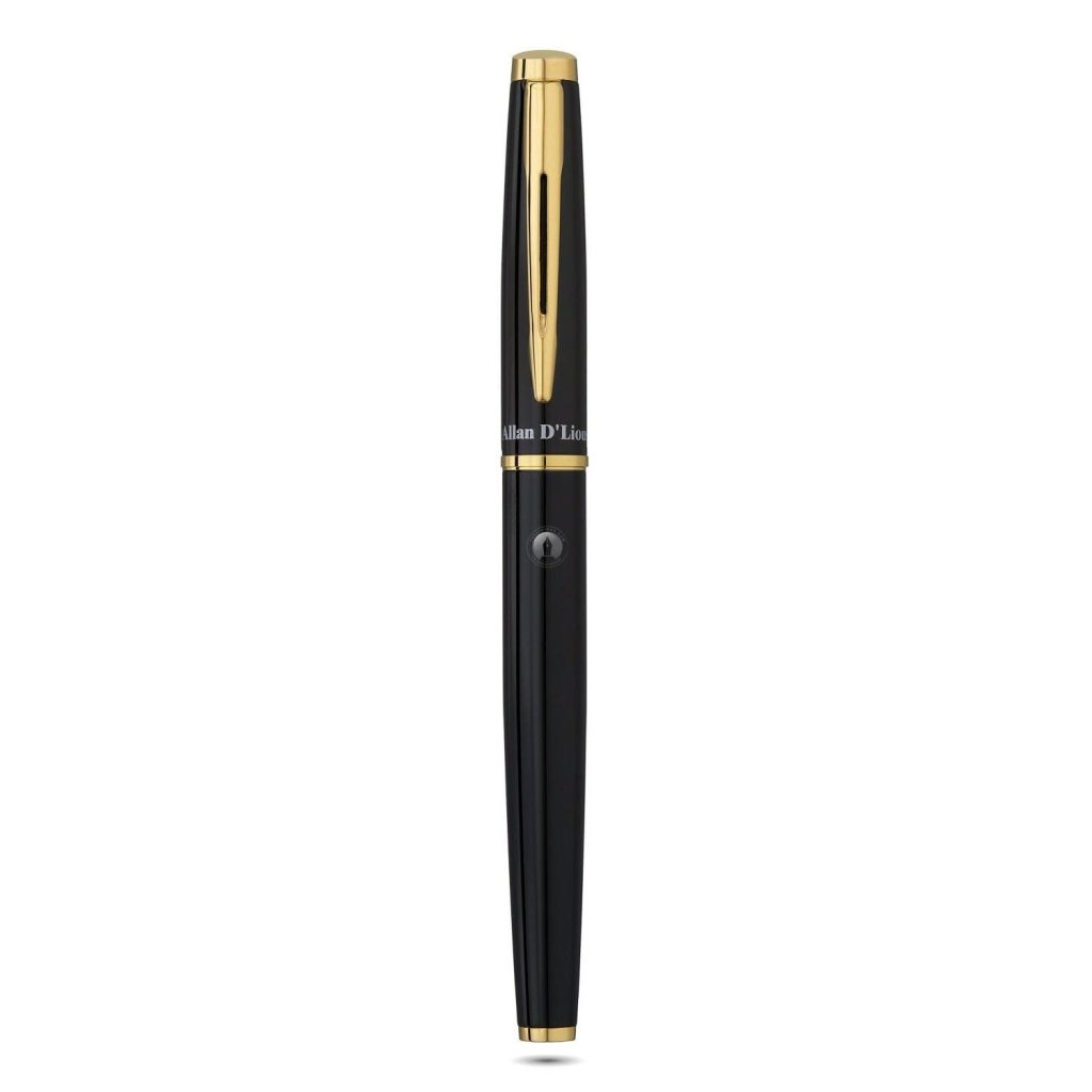 Được thiết kế theo hướng chuyên nghiệp hiện đại, bút dạ Allan D’lious AG4444 vô cùng đa năng, thông minh và ấn tượng, chắc chắn sẽ nổi bật ở bất kỳ nơi làm việc nào. Toàn thân bút AG4444 được làm bẳng thép không rỉ phủ sơn mài đen bóng cuốn hút và vô cùng sang trọng. Điểm nổi bật nhất của chiếc bút này là các chi tiết như cài áo, khoen và phần cằm bút được mạ vàng 18k sáng bóng và bắt mắt.