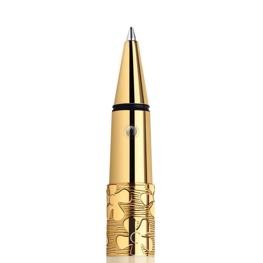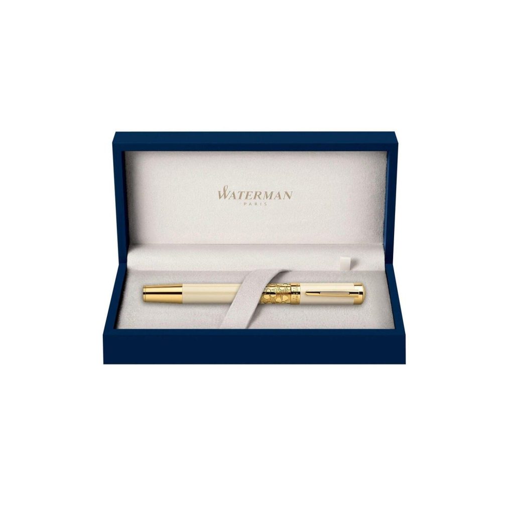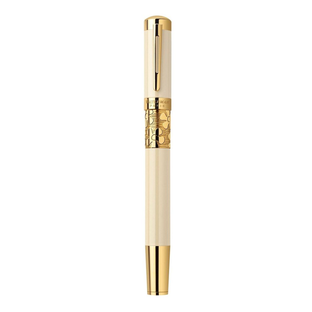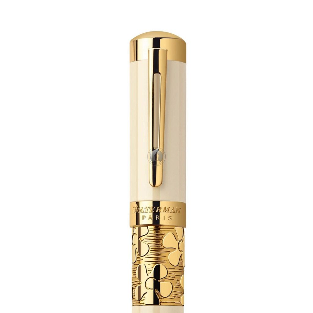 Dòng bút Waterman Elegance có thân sơn mài cao cấp, các phần còn lại mạ vàng 23K, hoa văn chạm khắc rất đẹp và sang trọng. Bút Waterman Elegance được thiết kế theo kiểu hai tông màu vàng và trắng ngọc trai được chạm khắc tinh tế, hoạ tiết lấp lánh của vàng 23K. Logo Waterman Elegance được giập công phu và mềm mại.