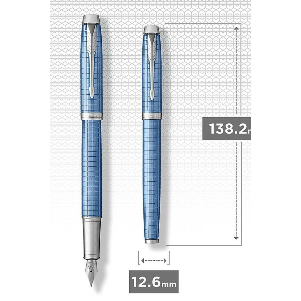 Viết máy Parker IM Premium Blue Fountain Pen có chiều dài tổng thể là 13.8 cm và đường kính thân 1.26cm. Trọng lượng của chiếc bút máy này khoảng 129g, khối lượng vừa phải giúp cho người cằm có cảm giác rất chắc tay. Chính đều này sẽ giúp cho bạn kiểm soát tốt nét chữ của mình khi lướt trên giấy. Cầm cây bút trên tay, bạn sẽ có cảm giác như chiếc viết máy Parker 1931688 này được tạo nên từ hàng trăm bàn tay của những nghệ nhân hàng đầu thế giới vậy. Mọi chi tiết dù nhỏ nhất đều được trau chuốt tỉ mỉ, không hề có một điểm lỗi nào.