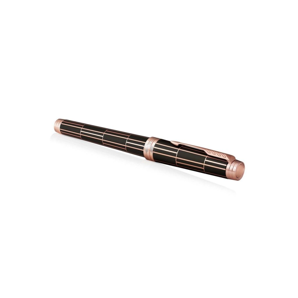 Dòng viết Parker Premier được sản xuất tại Pháp, nơi các kim loại quý được biến đổi bằng cách đánh bóng và chạm khắc một cách chuyên nghiệp để tạo ra lớp hoàn thiện đặc biệt nhất. Thân Parker Premier làm bằng đồng thau nguyên khối được phủ nhiều lớp sơn mài đen nâu cao cấp và sang trọng. Các chi tiết khác như khoen, cài được phủ vàng hồng sáng bóng và tinh tế. Logo Parker được dập chìm rõ nét và sắc sảo ở giữa 3 vòng khoen trên nắp bút (đoạn gần với thân bút). Điểm nhấn chính của Parker Premier 2017 Luxury Brown PGT Fountain Pen là toàn thân được trang trí với những đường cắt chéo ngang dọc sắc xảo, nghệ thuật và rất đẹp mắt.
