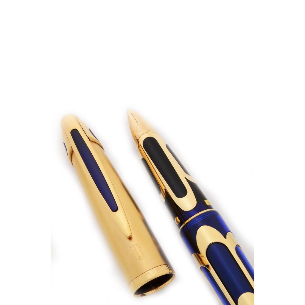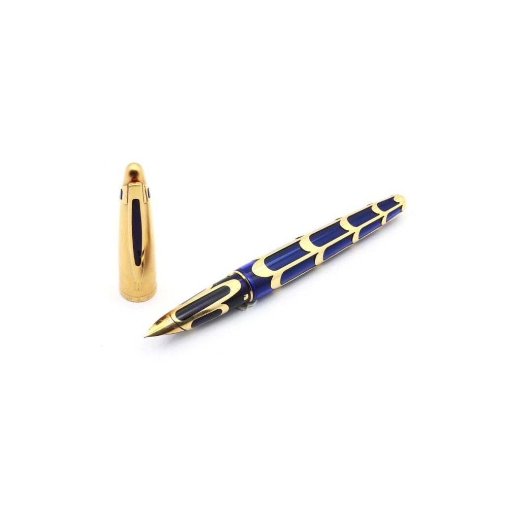 Có thể nói chiếc bút máy Waterman Edson Signe Boucheron 18K Gold Limited Edition có thiết kế hiện đại nổi tiếng nhất. Boucheron đã tạo ra một lớp bậc thang bằng vàng 18K bao bọc bên trong phần thân bút bằng nhựa Acrylic trong mờ màu xanh lam sang trọng và huyền bí. Nắp bút Waterman Edson Boucheron được làm bằng vàng khối 18K với cài bút giữ bằng ba đinh tán bằng vàng độc đáo. Nó được trang trí thêm phần nhựa màu xanh lam đặc biệt.