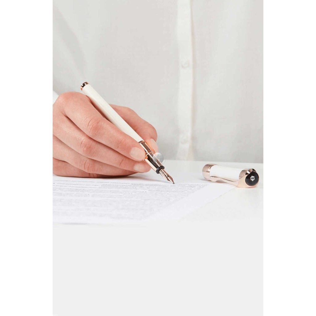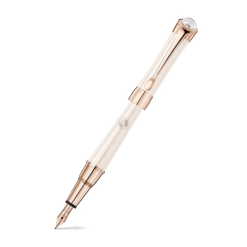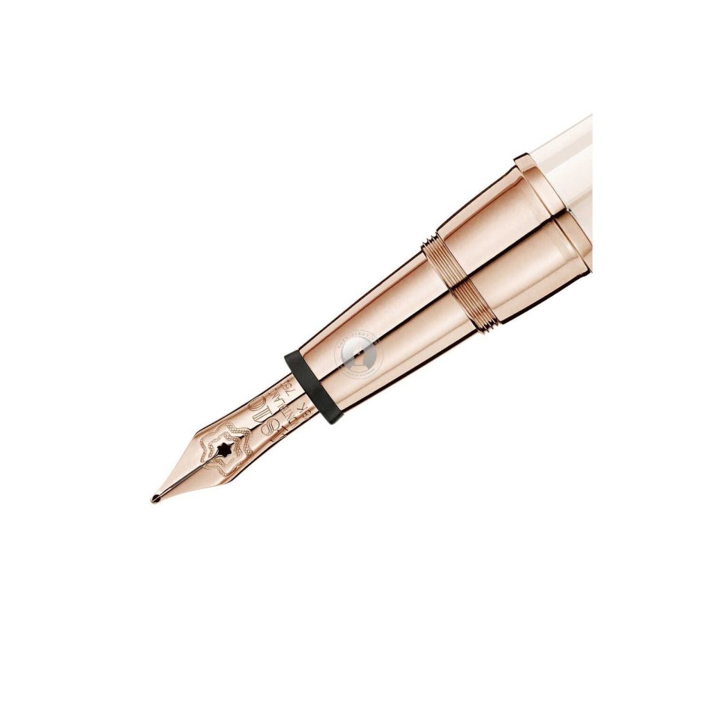 Như thường lệ, ngòi bút máy Montblanc Etoile De Sand Fountain Pen 113836 được làm thủ công bằng vàng hồng 18K. Với 2 logo Montblanc được chạm khắc lồng vào nhau rất tinh xảo và tỉ mĩ. Chính đều này đã tạo ra một chiếc bút máy cực kì đẹp mắt và quý phái khi trên tay một nữ doanh nhân.