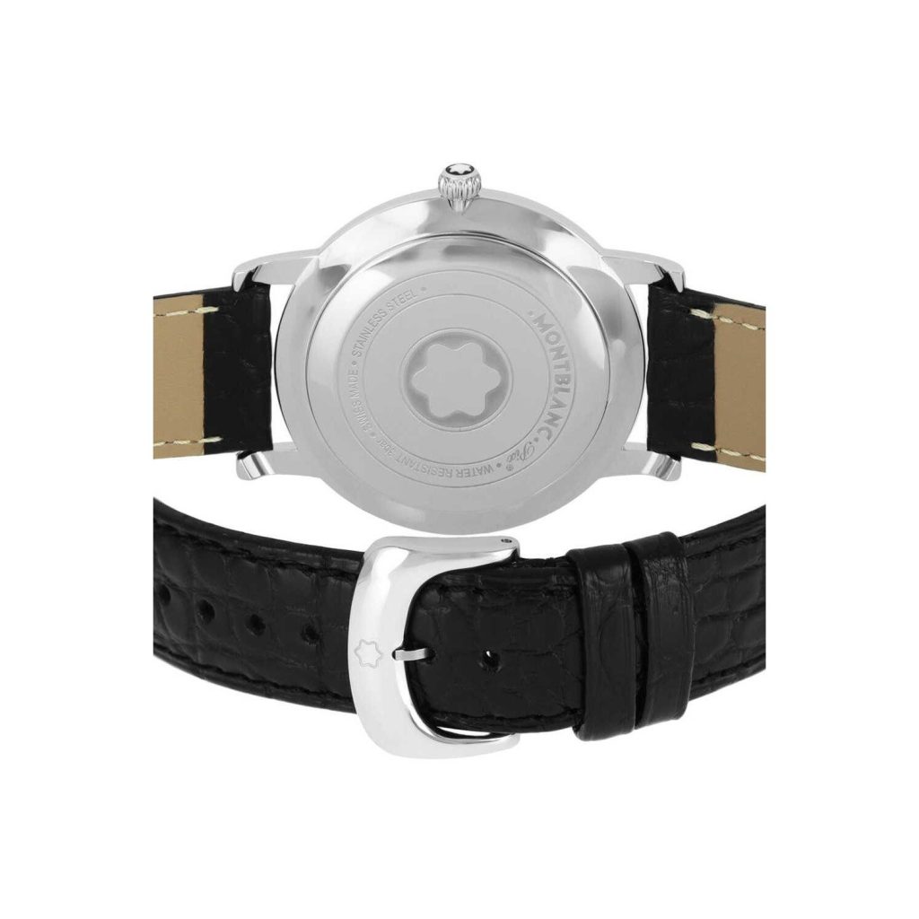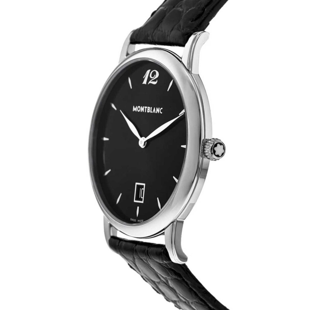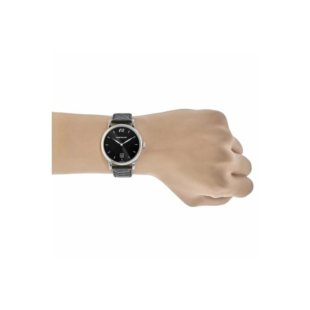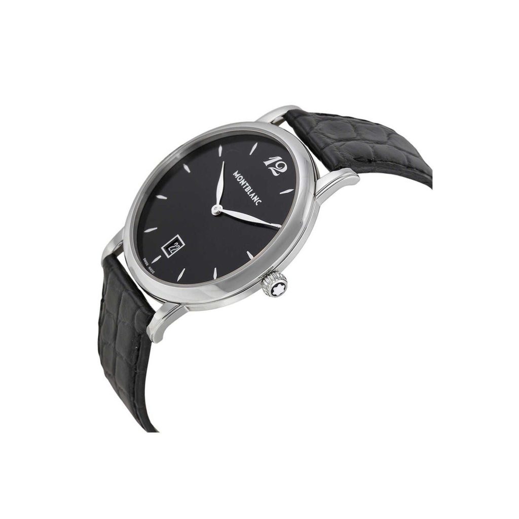 Montblanc Star Classique Black Dial Men’s Watch 108769 has a stainless steel case with a black (crocodile) leather strap. Fixed stainless steel bezel. Black dial with silver-tone hands and index hour markers. Arabic numeral marks the 12 o’clock position. Dial Type: Analog. Date display at the 6 o’clock position. Quartz movement. 4810/101 engine. Scratch resistant sapphire crystal. Solid case back. Case diameter: 39 mm. Case thickness: 8 mm. Round case shape. Strap width: 19 mm. Tang clasp. Water resistant at 30 meters / 100 feet. Functions: date, hour, minute. Dress watch style. Watch label: Swiss Made. Montblanc Star Classique Black Dial Black Leather Mens Watch 108769.