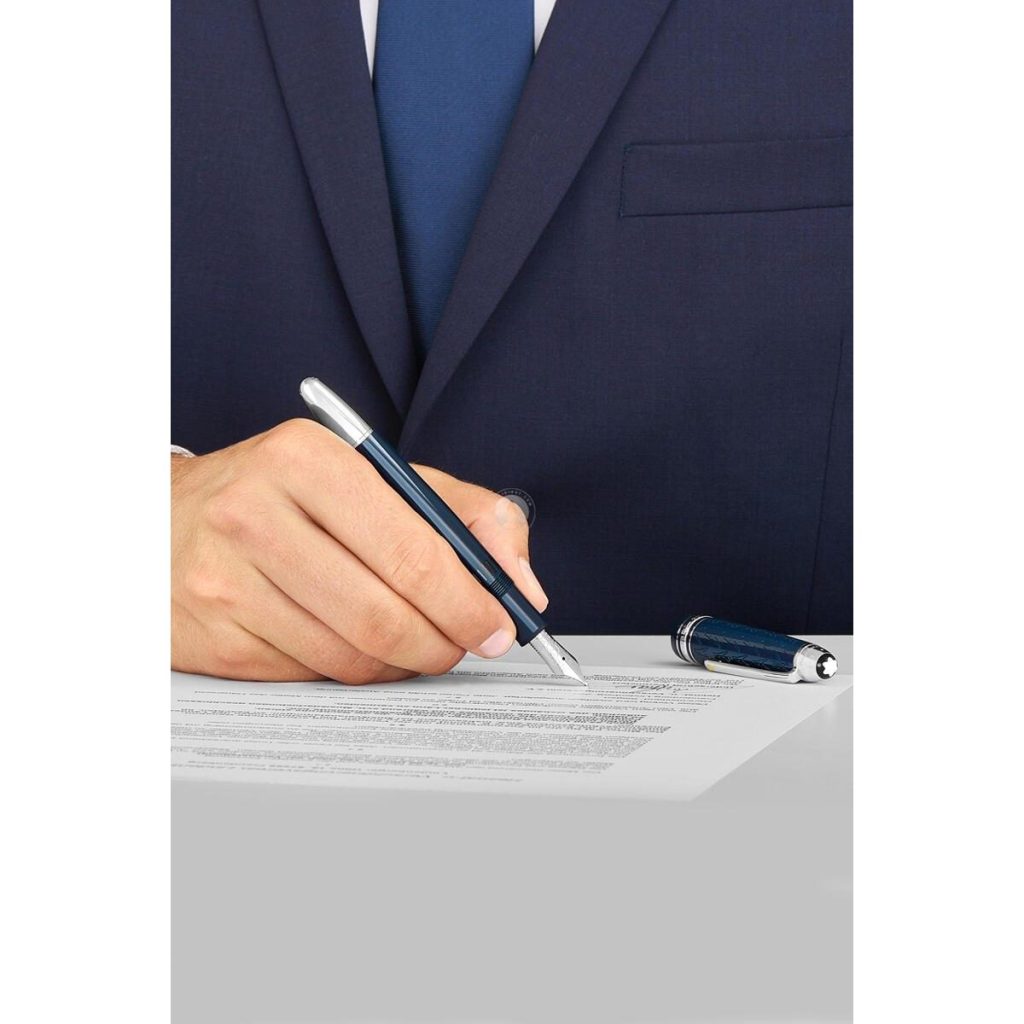 Bút máy Montblanc Meisterstuck Le Petit Prince Legrand Fountain Pen 118052 có thân bằng nhựa resin quý màu xanh đậm giống như bầu trời xanh thẳm của vũ trụ xung quanh hoàng tử bé. Đây là phiên bản đầu tiên trong bộ sưu tập Le Petit Prince của hãng Montblanc. Nắp Montblanc Le Petit Prince Legrand được trang trí với hoa văn mặt cáo đồng thời có một sao vàng được chạm khắc trên cài bút tinh xảo và nghệ thuật. Các chi tiết như cài bút, khoen và nắp mũ được mạ bạch kim tương phản với màu xanh đậm rất sang trọng.
