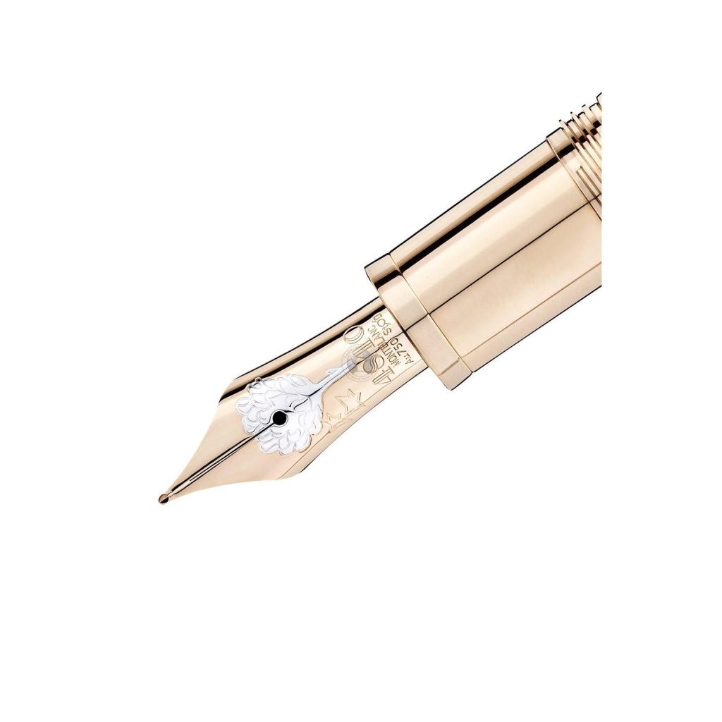 Bút máy Montblanc Meisterstuck Le Petit Prince Planet Solitaire Fountain Pen 125313 có ngòi viết bằng vàng nguyên khối Au 750/1000 được làm thủ công, phủ rhodium và vàng tông màu sâm panh, được trang trí bằng hình vẽ bông hồng của Hoàng tử Petit, biểu tượng của tình yêu giữa hai nhân vật.