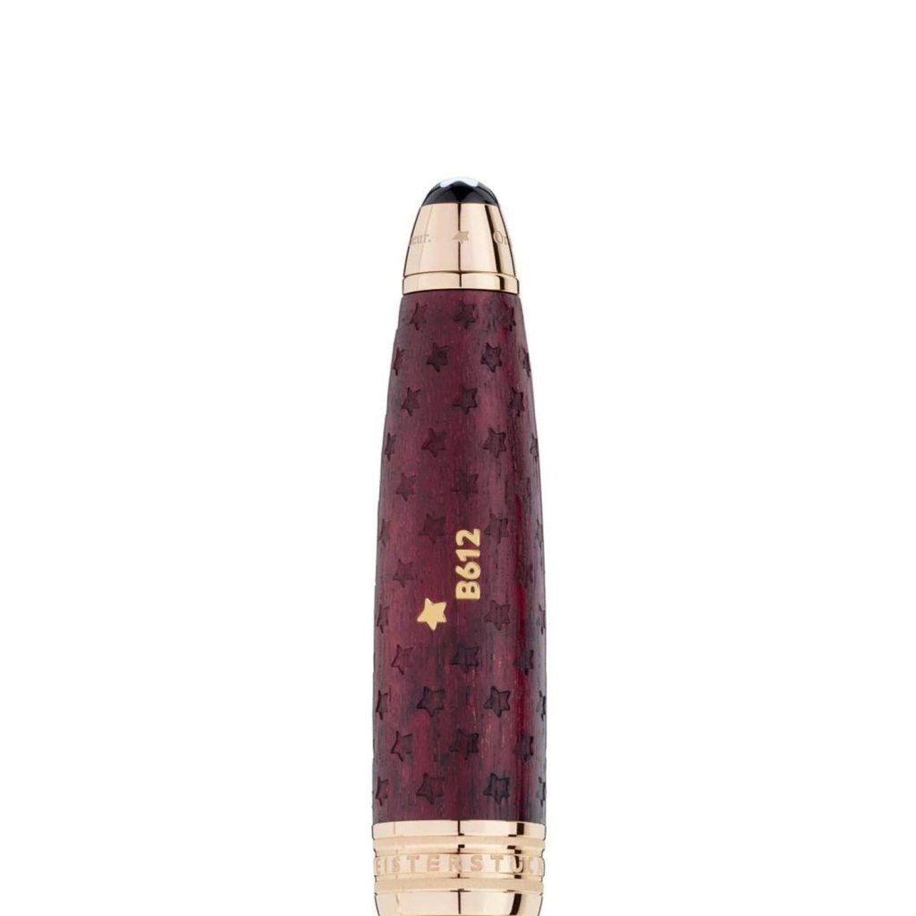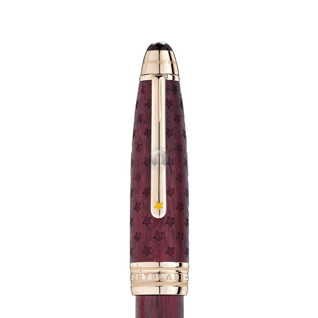 Thân viết máy Montblanc Meisterstuck Le Petit Prince Planet Solitaire Fountain Pen 125313 bút làm bằng gỗ quý nhuộm màu đỏ tía sang trọng. Vòng tròn trung tâm bút được phủ vàng tông màu sâm panh chạm khắc thương hiệu Montblanc. Chiếc cài bút được tô điểm bằng một ngôi sao sơn mài màu vàng. Logo màu trắng có hình hoa tuyết 6 cánh đặc trưng trên đỉnh nắp bút. Cơ chế hoạt động là mở nắp để viết. Dùng piston ẩn để bơm hút mực từ bình. Màu mực mặc định có thể là màu đen hoặc xanh tùy vào nhu cầu. Là dòng bút hot nhất hiện nay của hãng Montblanc.