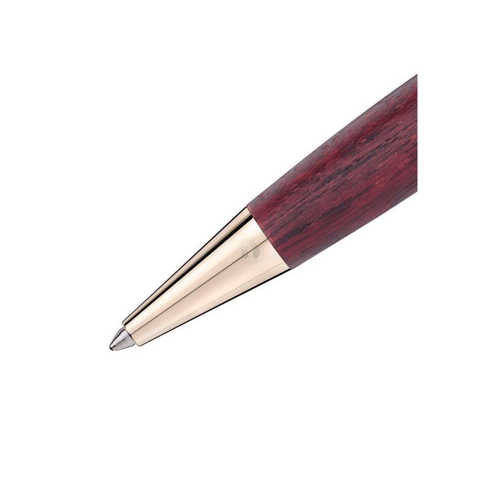 Thân viết bi Montblanc Meisterstuck Le Petit Prince Planet Solitaire Midsize Ballpoint Pen bút làm bằng gỗ quý nhuộm màu đỏ tía sang trọng. Vòng tròn trung tâm bút được phủ vàng tông màu sâm panh chạm khắc thương hiệu Montblanc. Chiếc cài bút được tô điểm bằng một ngôi sao sơn mài màu vàng. Logo màu trắng có hình hoa tuyết 6 cánh đặc trưng trên đỉnh nắp bút. Cơ chế hoạt động là xoay nắp ngòi lò ra để viết. Màu mực mặc định là màu đen, thay ruột bút bi Montblanc khi hết mực. Là dòng bút hot nhất hiện nay của hãng Montblanc.