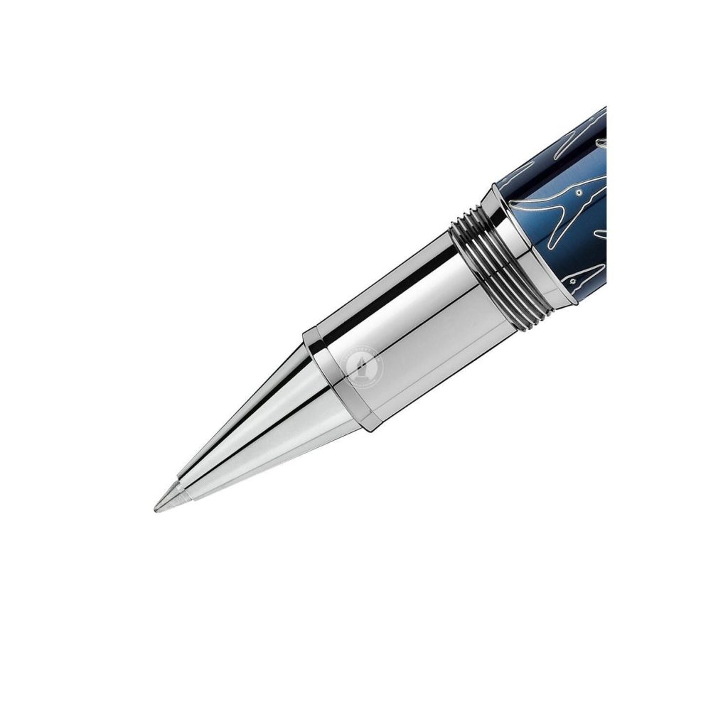 Chiếc bút dạ bi Montblanc Meisterstuck Le Petit Prince Solitaire LeGrand Rollerball 118066 được làm bằng nhựa resin quý màu xanh đậm giống như bầu trời xanh thẳm của vũ trụ xung quanh hoàng tử bé. Đây là phiên bản đầu tiên trong bộ sưu tập Le Petit Prince của hãng Montblanc. Nắp bút dạ bi Montblanc Le Petit Prince được trang trí với hoa văn mặt cáo với các chi tiết như cài bút được mạ bạch kim tương phản với màu xanh đậm rất sang trọng.