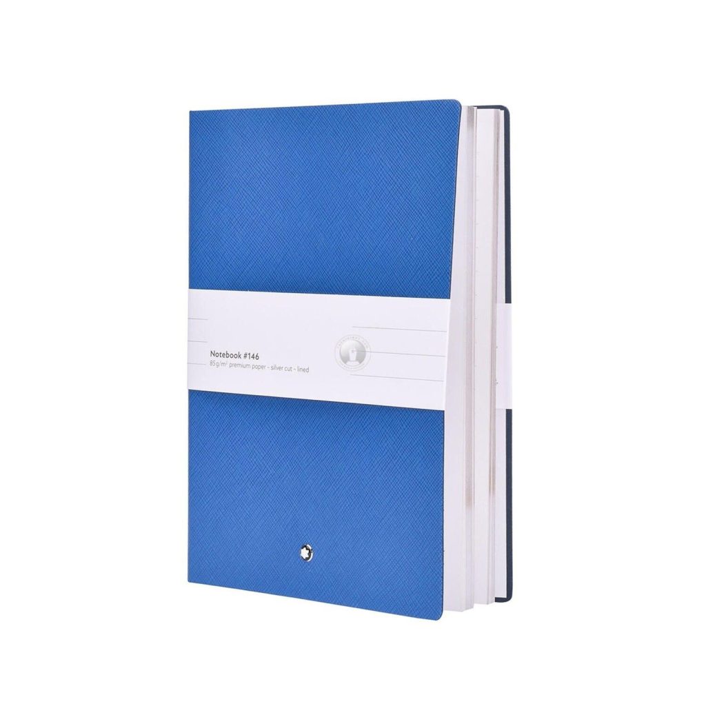 Tiếp đến là sổ tay doanh nhân Notebook 146 Technicolor Blue 124172 tông bìa màu xanh sản xuất tại Ý. Được làm bằng da bê có in Saffiano và được hoàn thiện với các cạnh cắt bằng bạc và dấu trang màu đỏ phù hợp. Bên trong là giấy cao cấp loại kẻ sọc ngang giúp việc ghi chép được thẳng hàng. Quyển sổ có kích thước 150 x 210 mm. Bộ Gift Set này là sản phẩm độc quyền của MontBlanc rất có giá trị làm quà tặng vào các dịp lễ hoặc những nhân vật lớn.