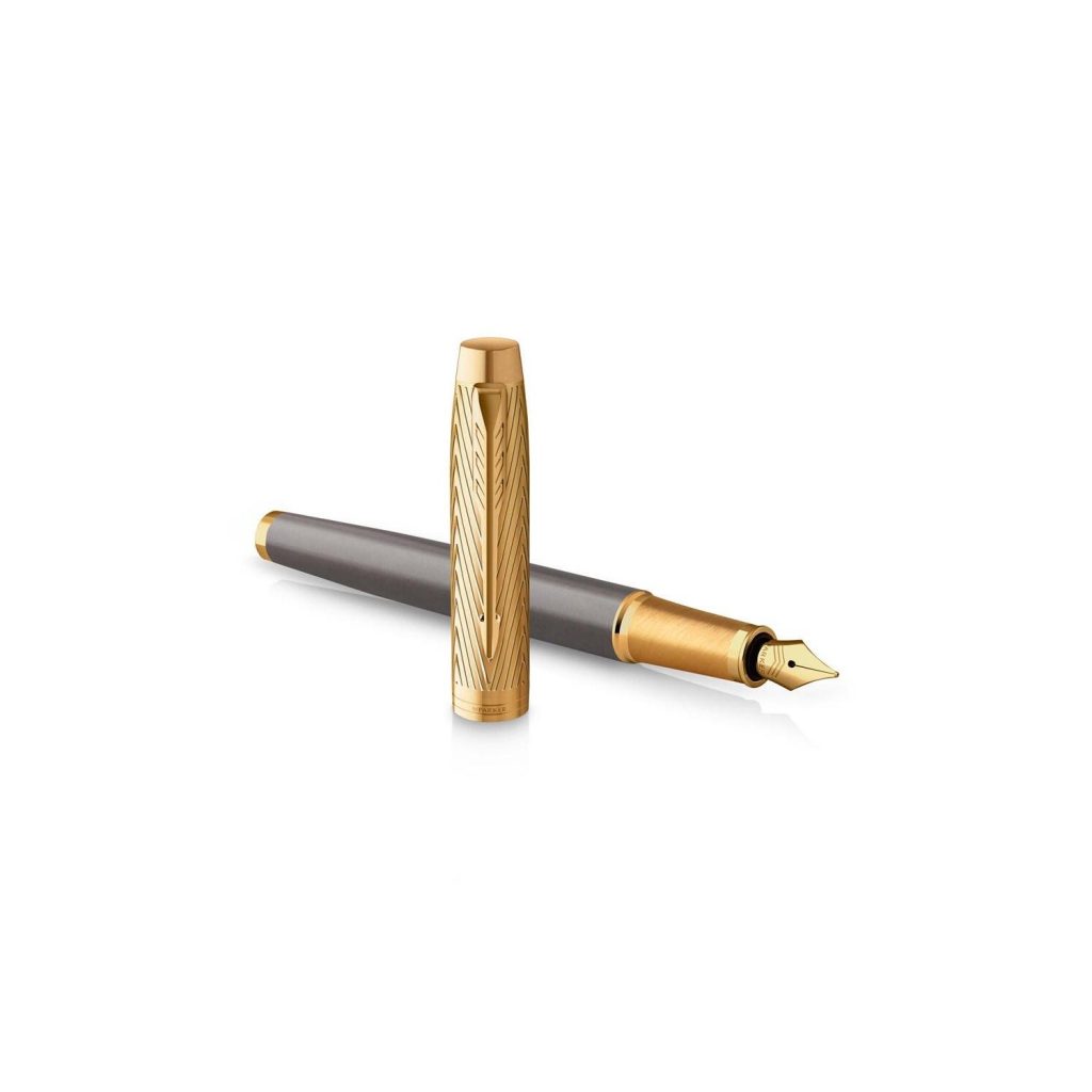 Viết máy Parker IM Pioneers Fountain Pen 2200956 là phiên bản cao cấp trong bộ sưu tập Parker Pioneers vừa được hãng giới thiệu và cho ra mắt vào đầu năm 2024. Parker Pioneers được sản xuất hoán toàn tại Pháp với điểm nhấn là phần nắp bút phủ vàng với họa tiết chevron hình mũi tên hướng lên trên, biểu thị tư duy cầu tiến và tượng trưng cho thái độ tiên phong của George Parker. Cùng với thân màu xám lấy cảm hứng từ màu đặc trưng của thương hiệu Parker là chiếc hộp được thiết kế riêng biệt và đồng nhất.