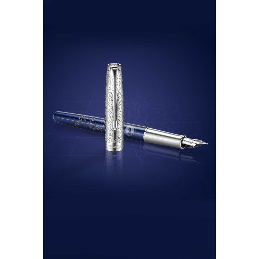 Đặc biệt thân bút máy Parker Sonnet Special Edition Atlas Fountain Pen 2054839 được làm bằng thép không gỉ phủ một lớp sơn mài màu xanh satin tượng trưng cho đại dương bao la. Ngoài ra thân bút Parker Sonnet Special Edition Atlas 2054839 còn được khắc laser hiện đại thiết kế bản đồ rất chính xác đưa chúng ta vào cuộc hành trình bất tận qua 7 lục địa, cho phép chúng ta điều hướng đến những điểm đến mới. Chiếc nắp được làm bằng bạc Sterling (độ bạc tối thiểu là 92,5%) với các điểm nhấn mạ palladium. Chiếc vương miện trên đầu nắp được mạ bằng hợp kim nicken và palladium sáng bóng và mềm mịn. Parker Sonnet Special Edition Atlas cho phép bạn điều hướng hành trình cuộc đời và lấp biểu đồ cho những chân trời mới. Đặt cả thế giới trong từng con chữ.