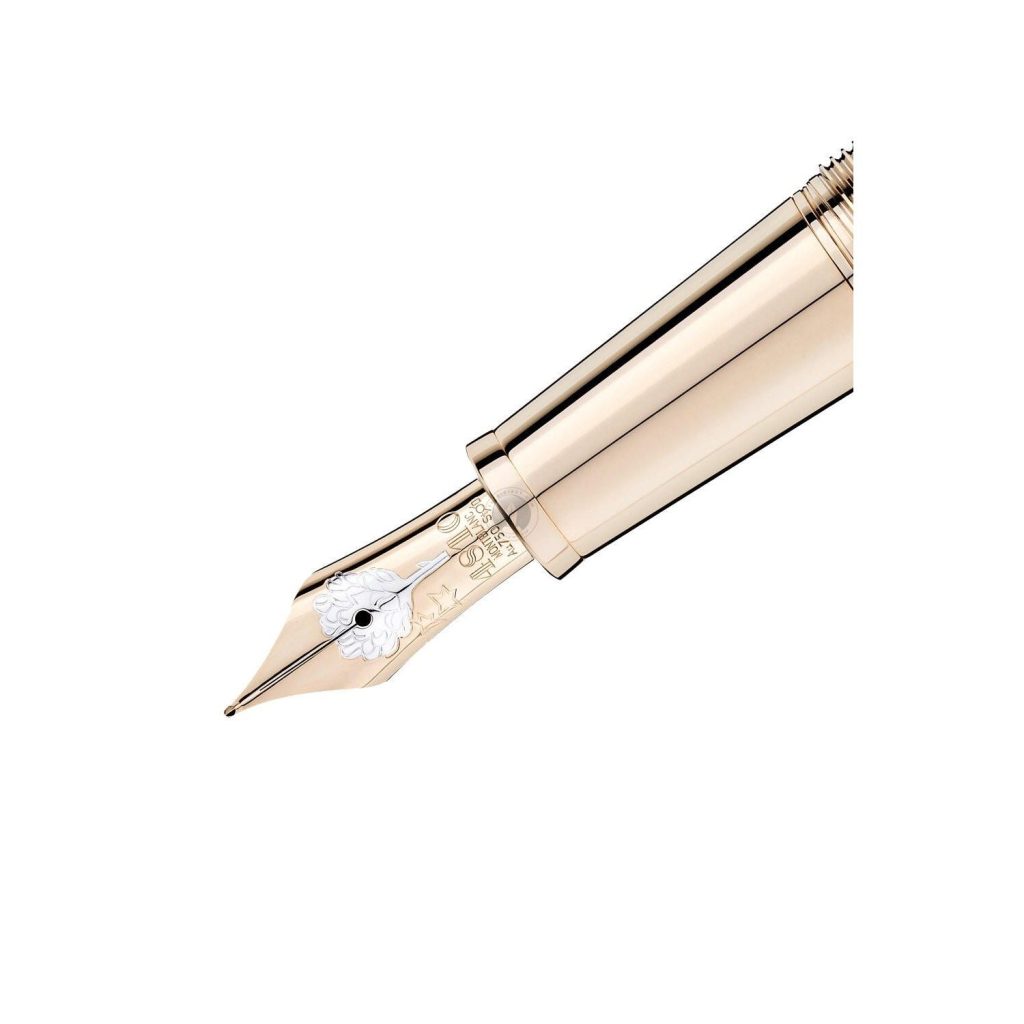 Nắp bút Montblanc Meisterstuck Le Petit Prince Planet Doue Fountain Pen được mạ vàng màu champagne với các ngôi sao được khắc trang trí trên đó lấy cảm hứng từ tên của tiểu hành tinh B612 trong tác phẩm. Thanh cài clip được tô điểm bằng một ngôi sao sơn mài màu vàng đặc trưng của dòng sản phẩm này. Bút Montblanc MB125299 có cơ chế xoay nắp để viết và dùng ruột bút bi Montblanc thay thế khi hết mực. Sản phẩm mới 100% bảo hành toàn cầu 36 tháng. Bút máy Meisterstück Le Petit Prince Doué Classique với chiếc ngòi mạ vàng thủ công Au750/18K và được trang trí bằng hình vẽ hoa hồng của Hoàng tử Petit, một biểu tượng của tình yêu giữa hai nhân vật.