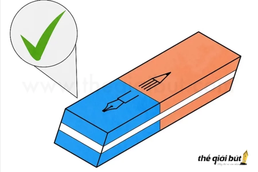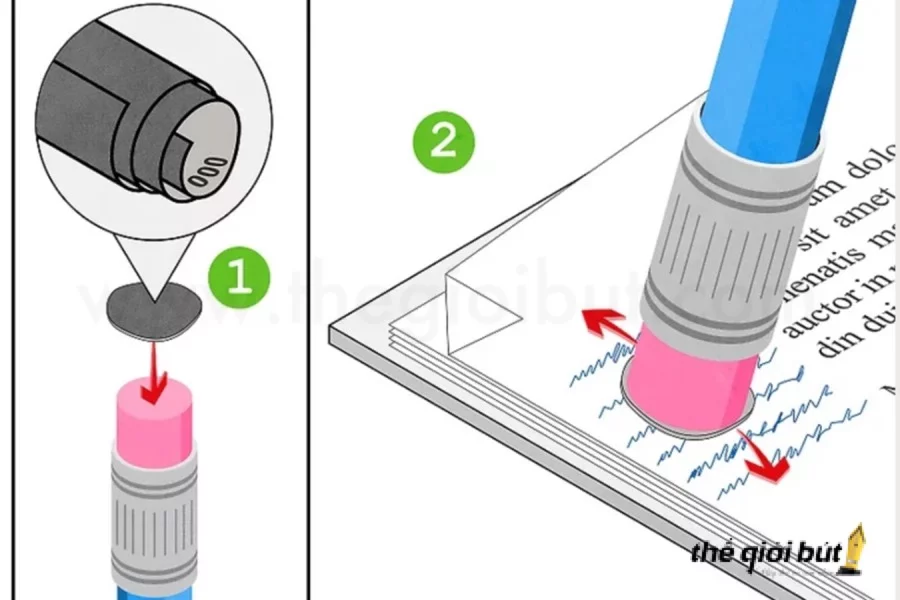 Bạn cũng có thể tìm thấy loại có thiết kế như bút chì, với một đầu là bút chì và đầu còn lại là cục tẩy ( bút máy thường không có bộ phần này). Nếu dùng mực có thể tẩy được thì bạn sẽ dễ dàng làm sạch vết mực bằng gôm tẩy mực. Gôm tẩy mực thường có màu xanh biển, không phải đen và trên nhãn thường ghi là “có thể xóa được”..